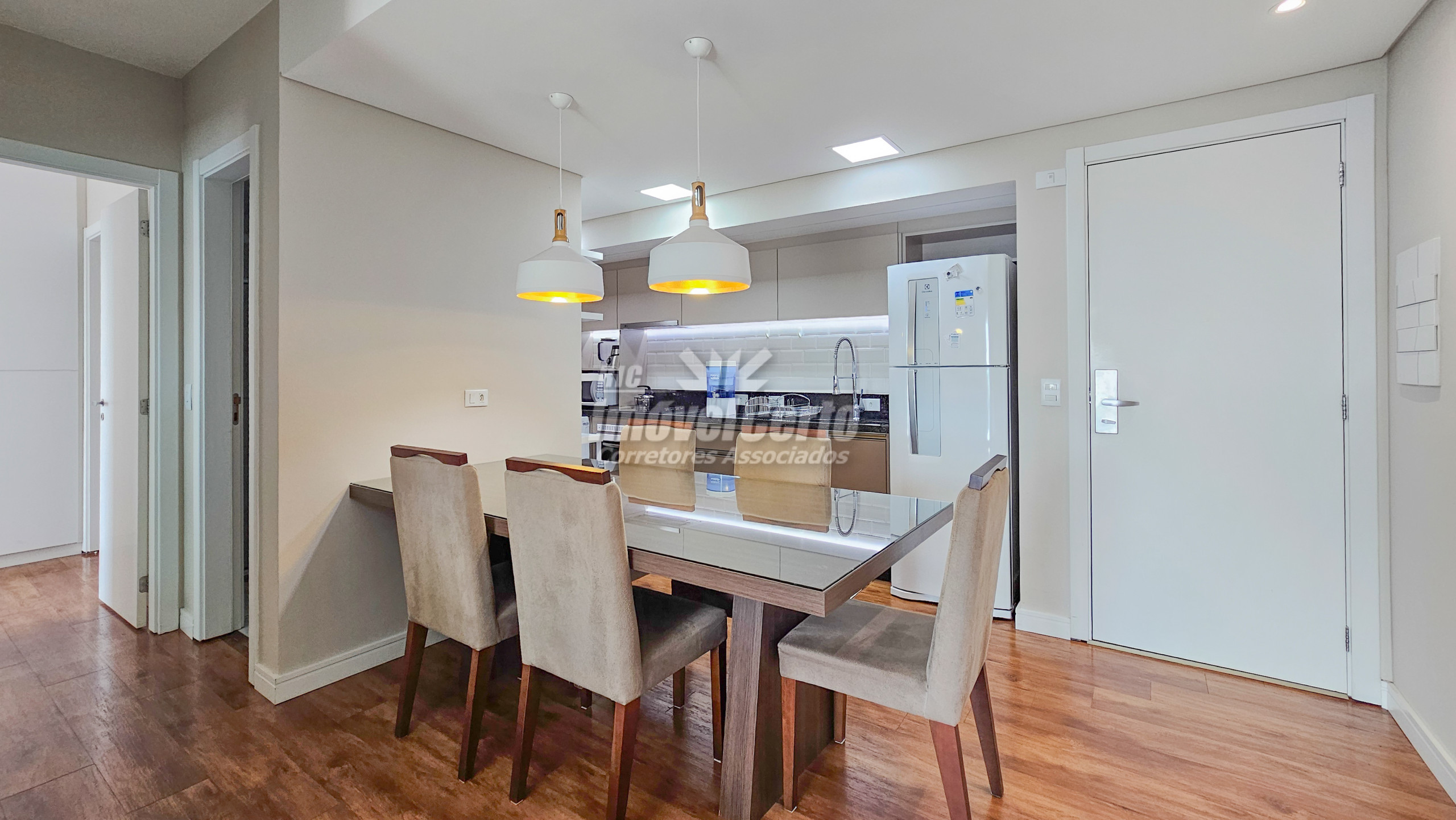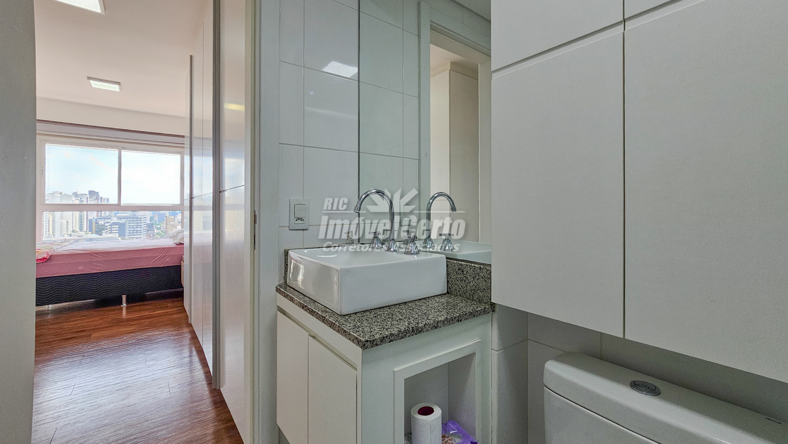 O apartamento conta com armários projetados de alta qualidade em ambos os dormitórios, banheiros e na cozinha. Apartamento no 20º andar, com vista livre permanente para o oeste.