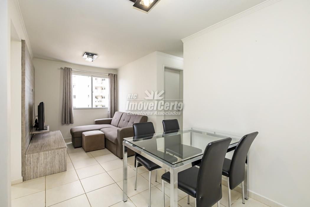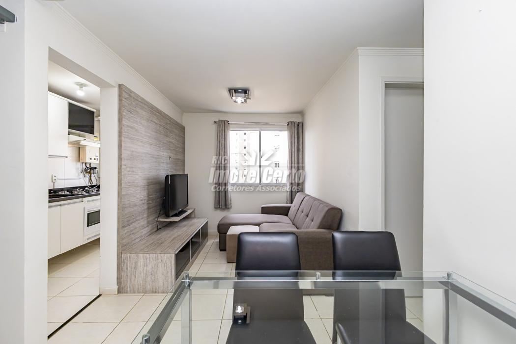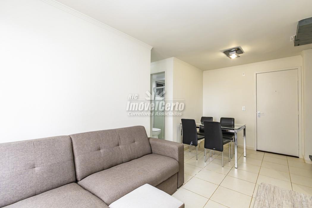 Mobiliário incluso: mesa de vidro com cadeiras, sofá e rack para TV.