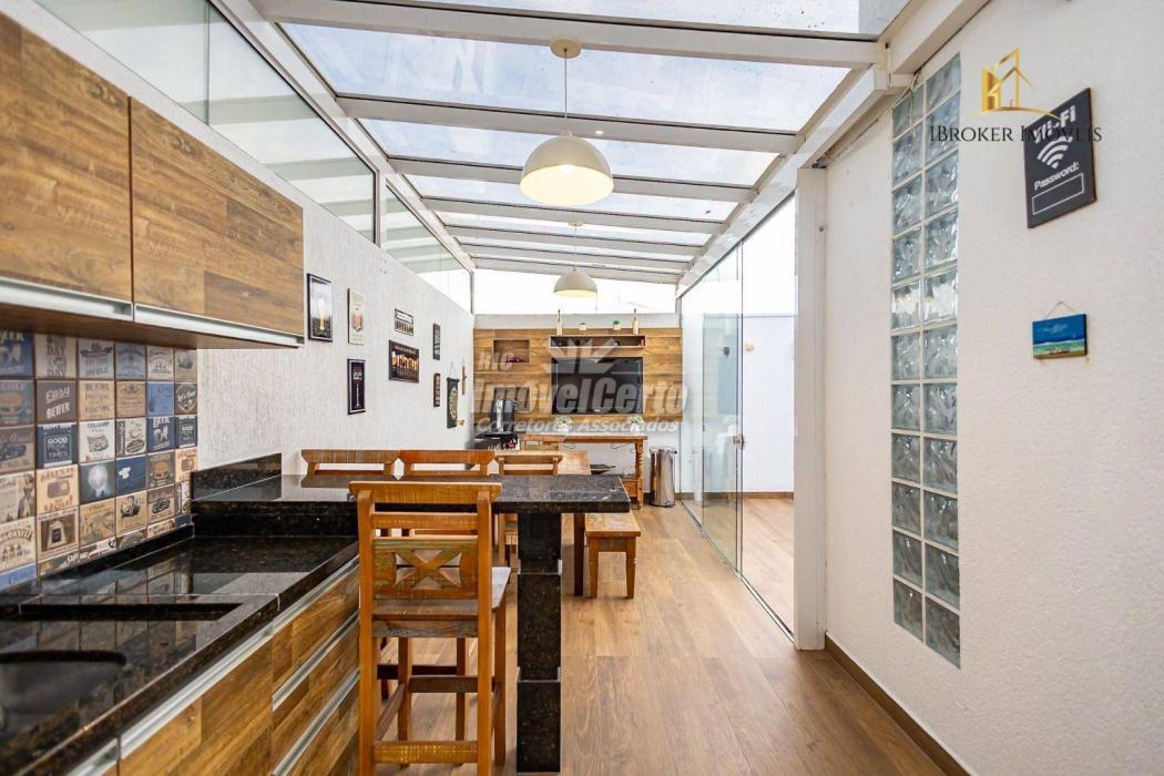 - Área gourmet com uma ótima churrasqueira, armário com pia de apoio e mesa elevada em granito integrada a um lindo quintal espaçoso, ideal para momentos de lazer.