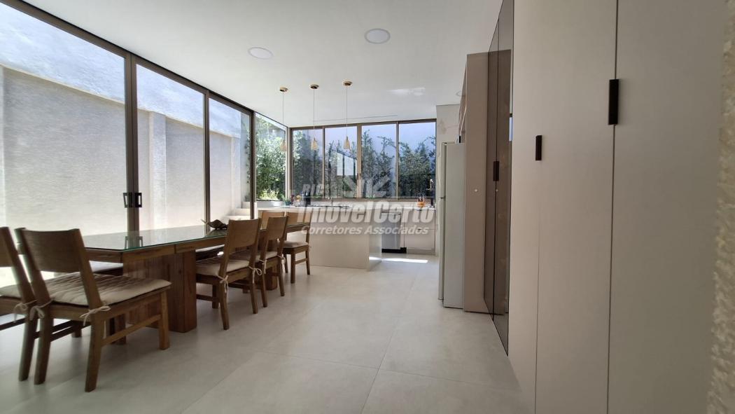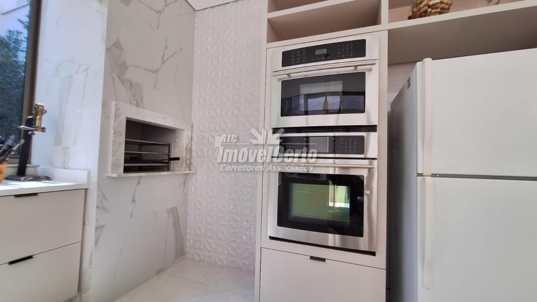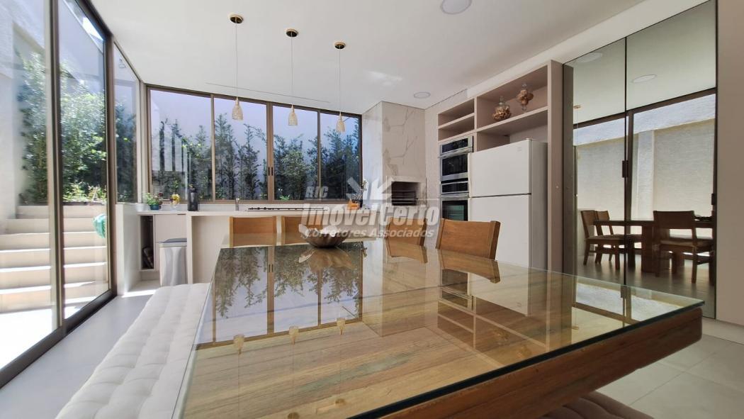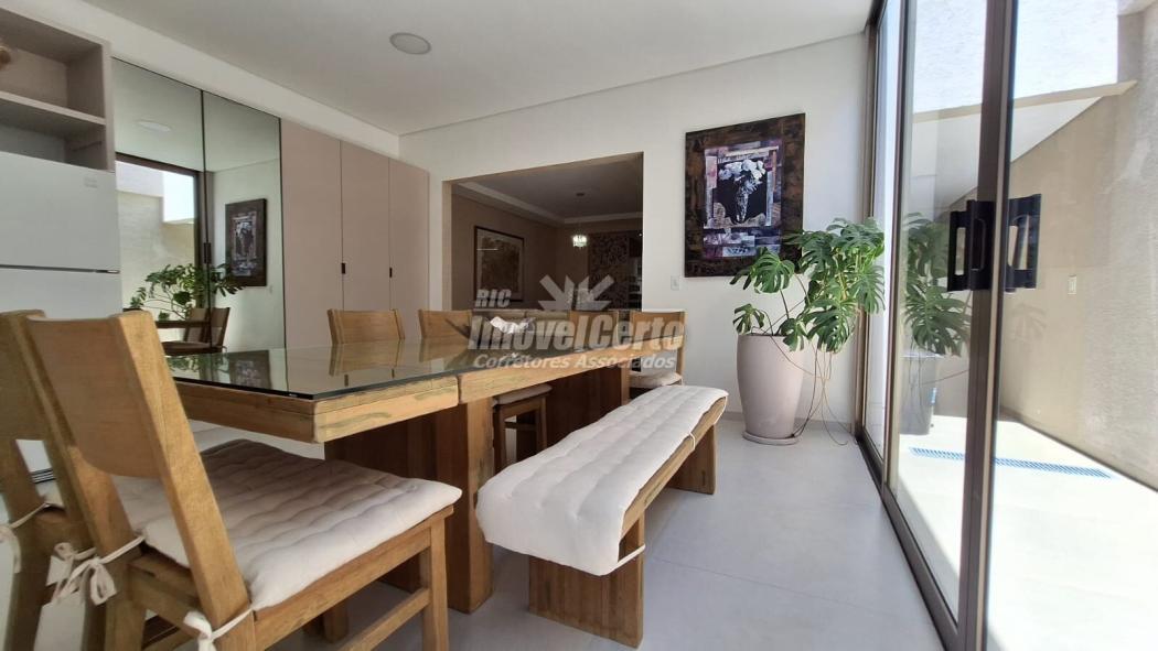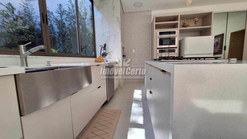 Os ambientes são integrados de forma harmônica: sala, copa e espaço gourmet com móveis planejados, churrasqueira e ilha de preparo, criando um cenário perfeito para receber.
