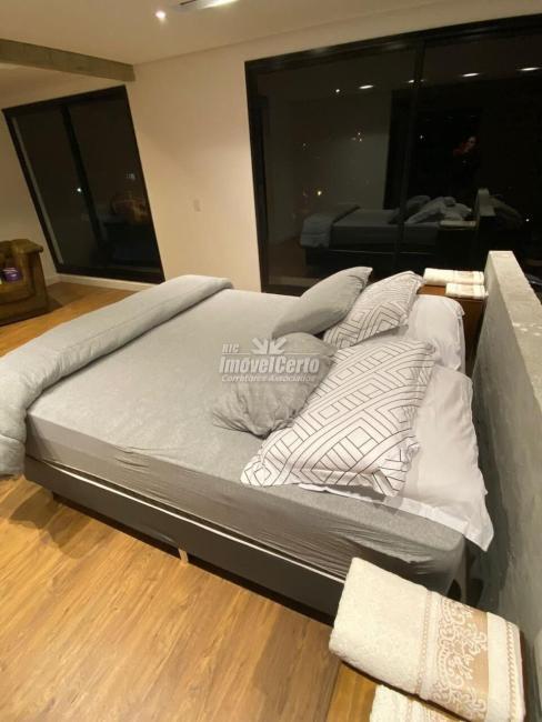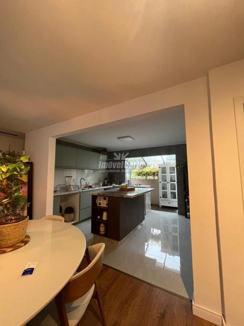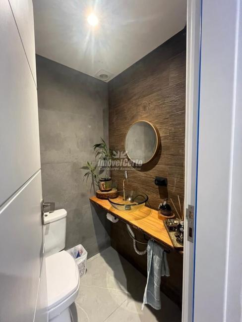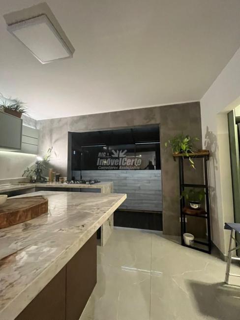 No pavimento térreo, a área social se destaca pela integração. Living, sala de TV, lounge e sala de jantar conversam entre si de forma fluida. A cozinha planejada com ilha central reforça a proposta contemporânea e funcional, ideal para quem gosta de receber. Ainda nesse nível, há uma suíte ampla que atende perfeitamente situações de acessibilidade ou acomoda hóspedes com privacidade.