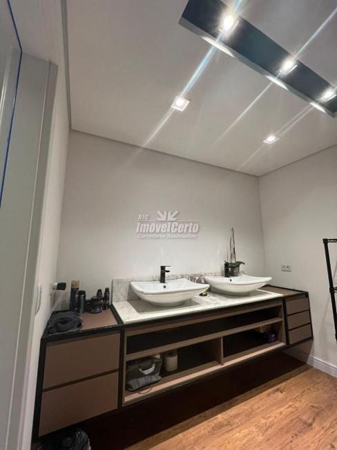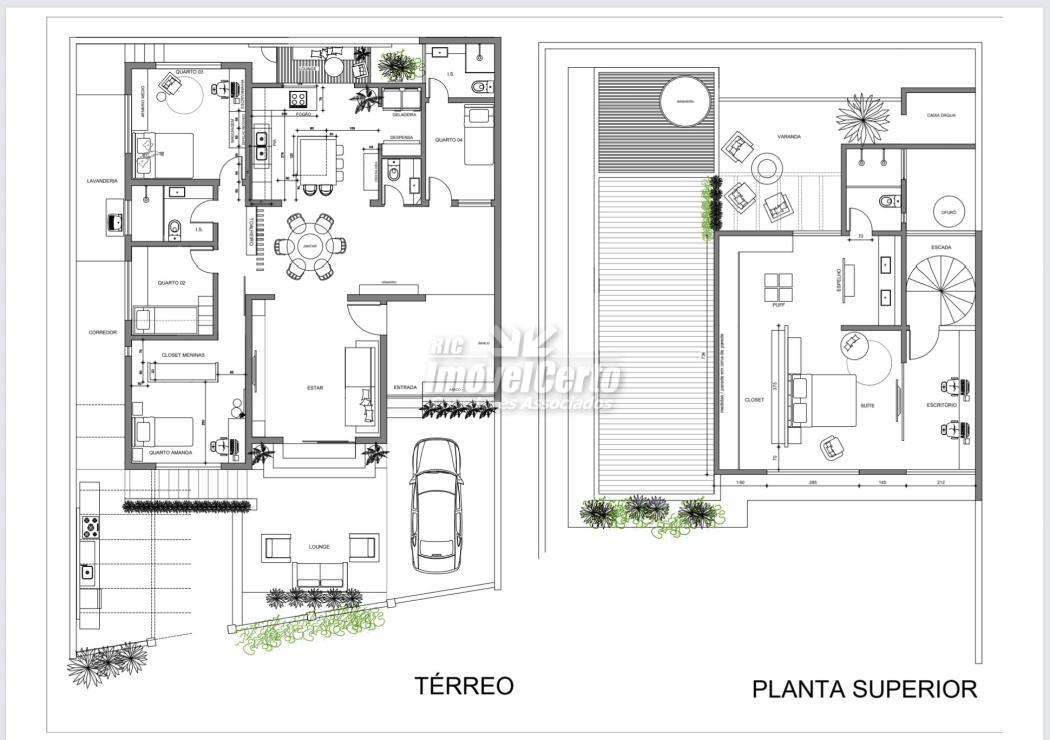 No pavimento superior, a área íntima é bem resolvida. A suíte master conta com closet e espaço para escritório, solução prática para quem trabalha em casa. Um setor privativo adicional reúne três dormitórios, banheiro próprio e closet compartilhado, oferecendo organização inteligente para famílias maiores.